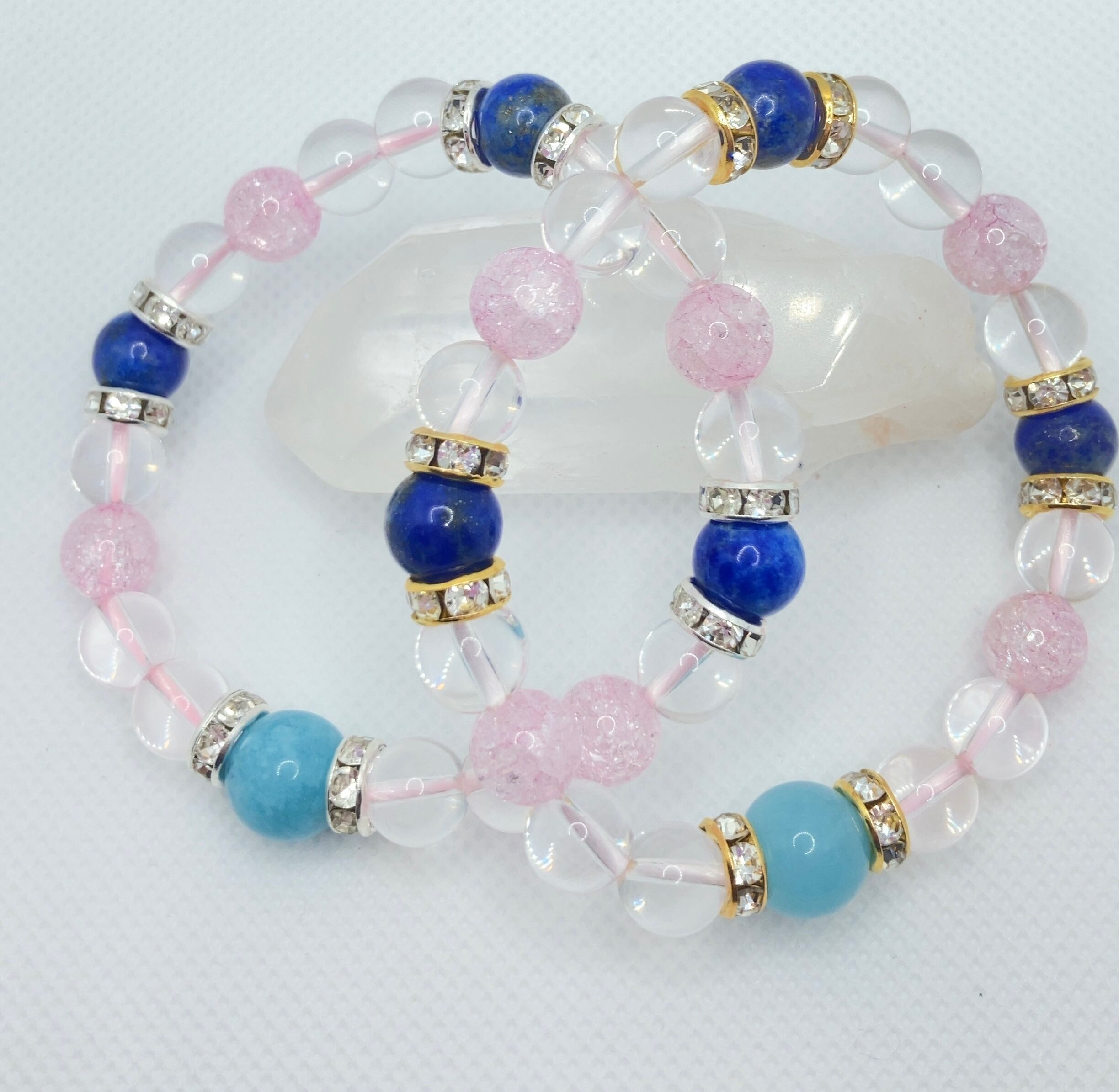 アクアマリン、ラピスラズリ、ピンククラック水晶、水晶で構成されたブレスレットは、澄んだ色合いと魅力的なデザインが特徴です。