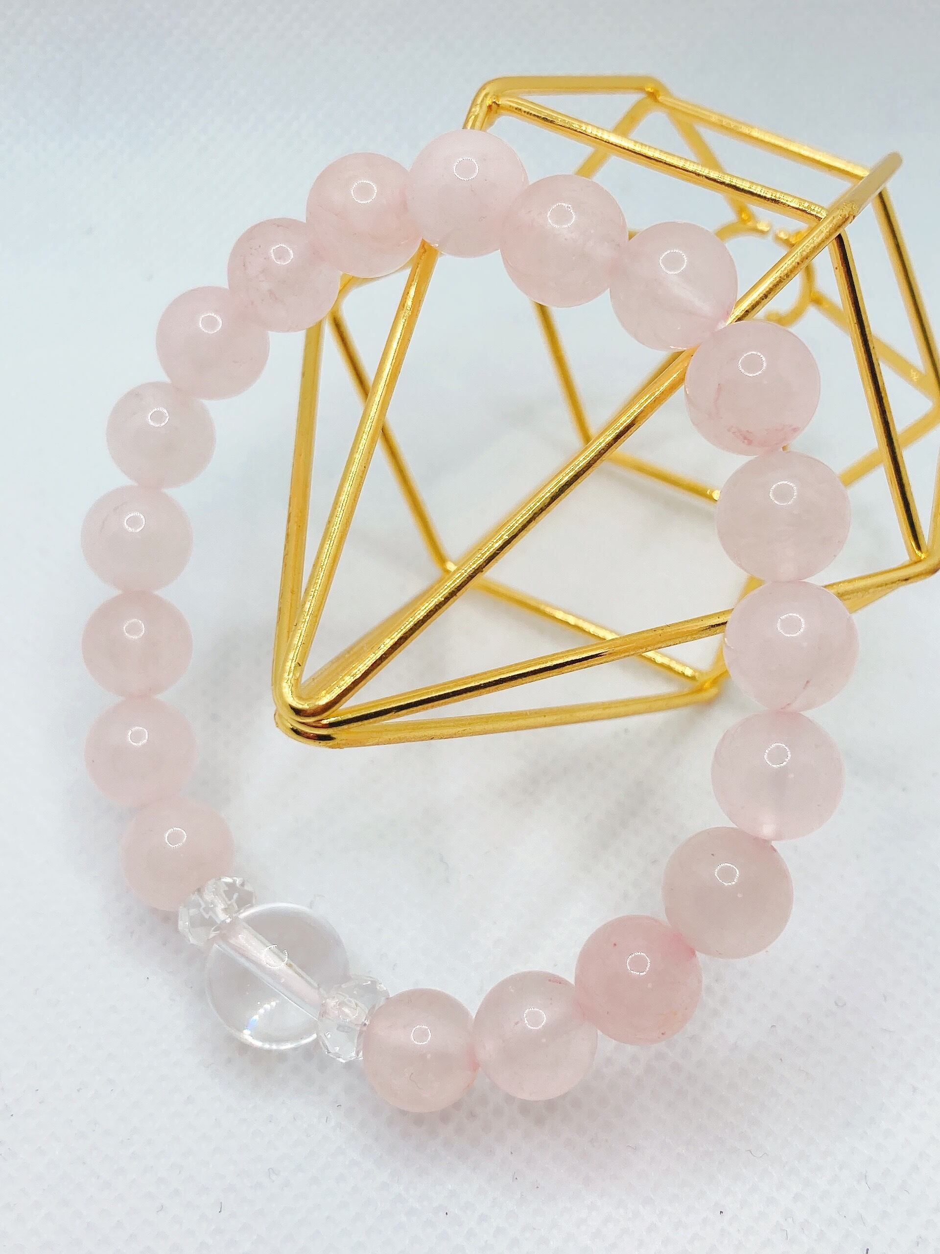 ローズクォーツ8mm、水晶10mm、ボタンカット水晶6mm×3mmで構成されたこのブレスレットは、柔らかなピンク色と透明感のある水晶が美しく調和し、優雅でリラックスした印象を与えます。ローズクォーツは愛と癒しの石とされ、心を開放し、愛情を深める力を持っています。
