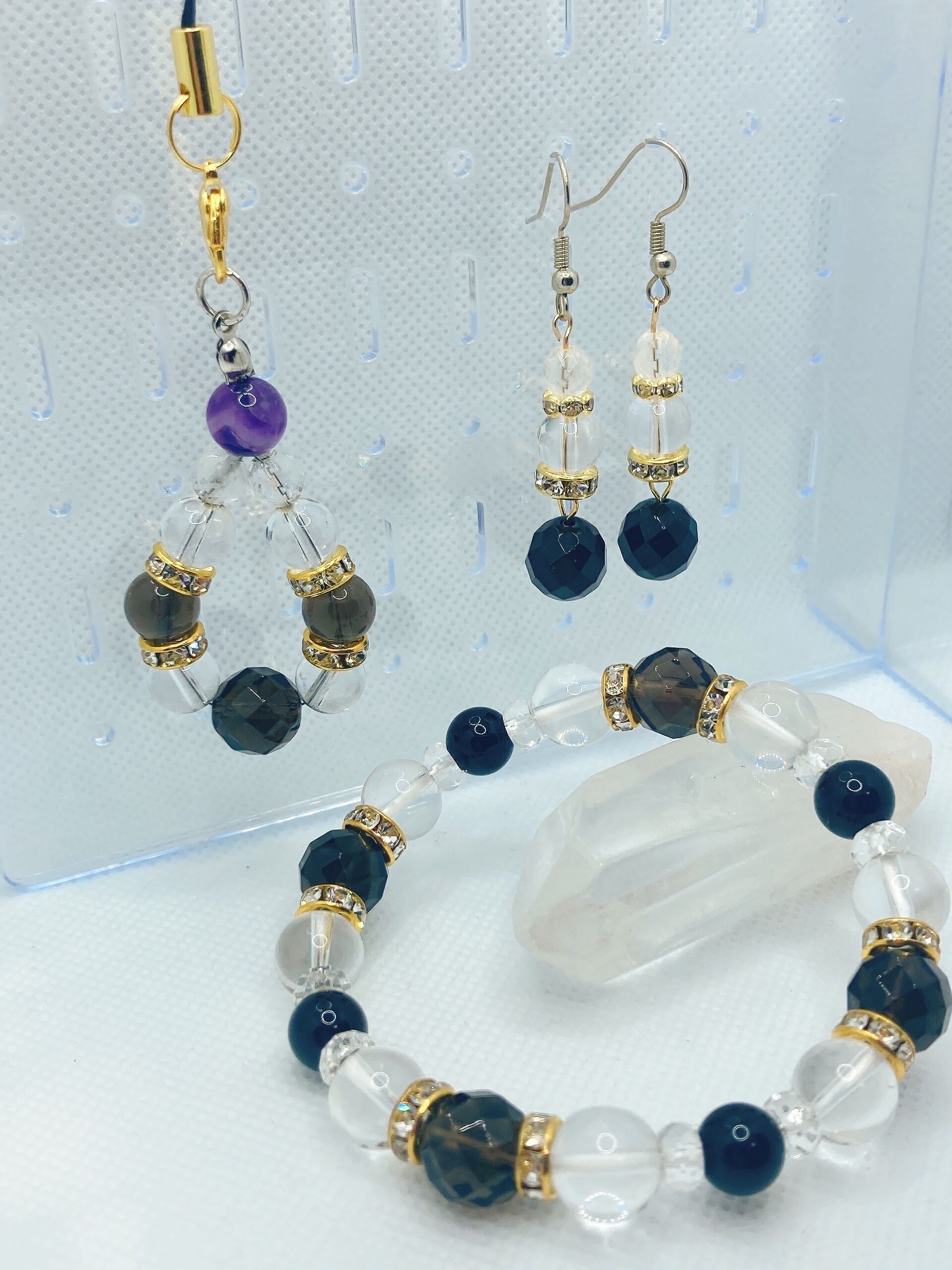 このピアスは、スモーキークォーツ、水晶の天然石が組み合わさった、癒しと厄除けのエネルギーが漂う特別なアクセサリーです。スモーキークォーツは、深いグレーの色合いと美しい64面カットによって、持ち主に安定感とストレス軽減の力を与えます。水晶は浄化の代表的な石であり、全体のエネルギーを整える役割も果たします。このピアスを身に着けることで、あなたの日常にリラックスと安らぎをもたらすことが期待されます。