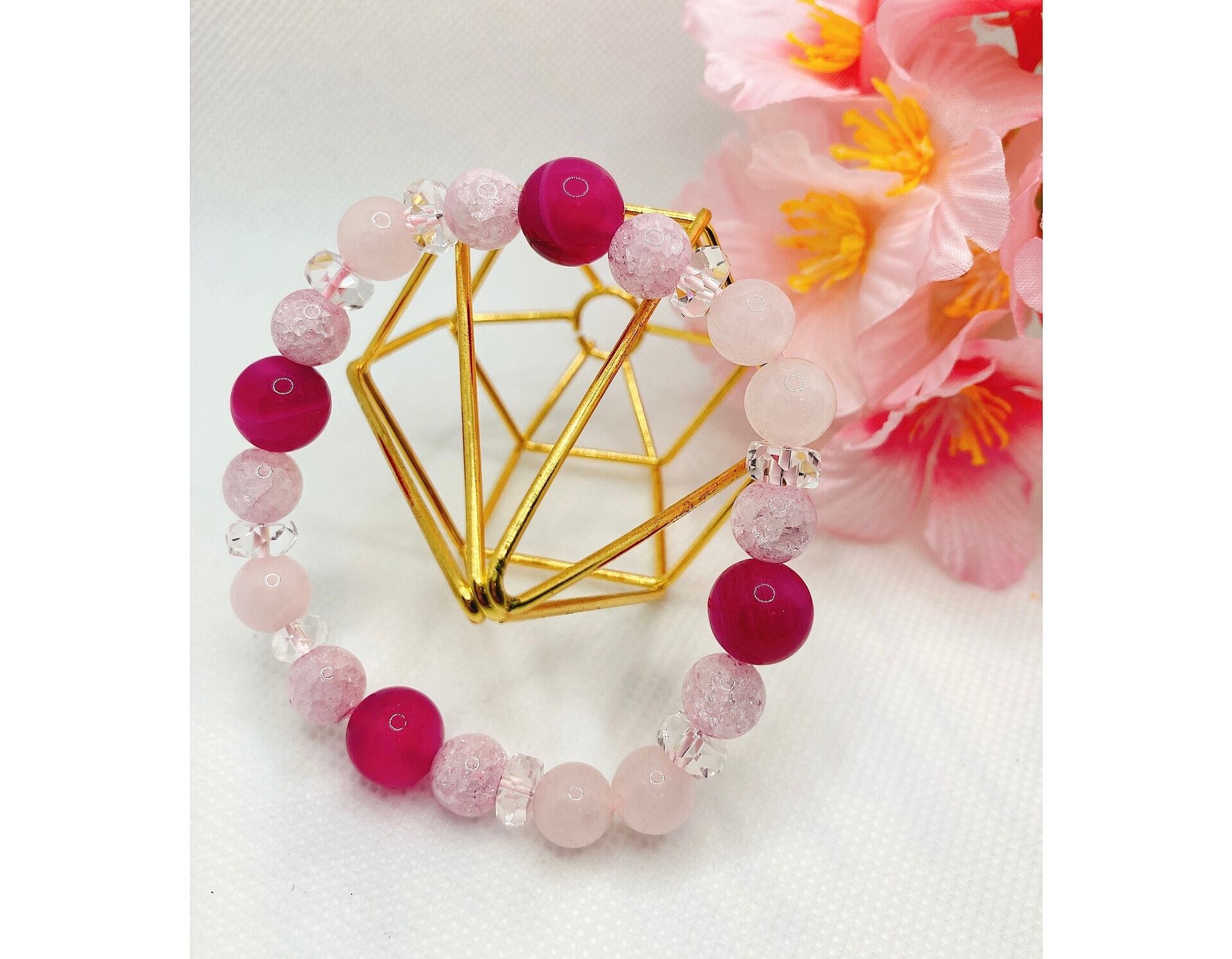 このブレスレットは、桜縞瑪瑙(アゲート)、ローズクォーツ、ピンククラック水晶、カットボタン水晶が組み合わさった、恋愛や人間関係を豊かにするクオリティの高いアクセサリーです。桜縞瑪瑙は、愛と癒しのエネルギーをもたらし、心を穏やかに保ってくれるパワーを持っています。また、ローズクォーツは自己愛を育み、他者との深いつながりを持つサポートをし、ピンククラック水晶はポジティブなエネルギーを引き寄せます。このブレスレットを身に着けることで、あなたの周りに優しさと愛情が広がることが期待されます。